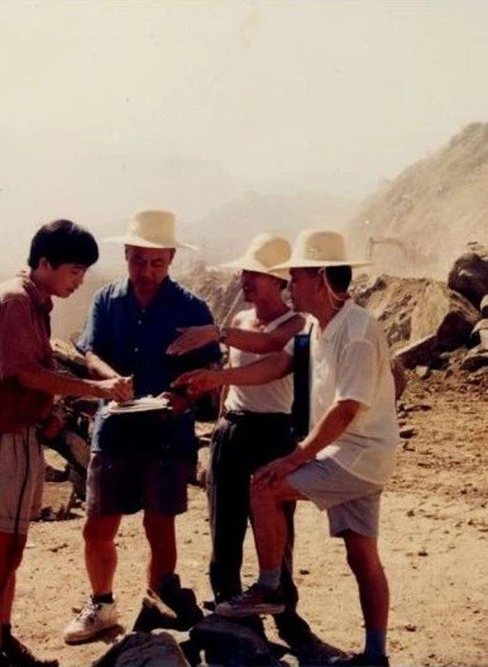 1994年,导流明渠右边坡设计,郑守仁(左二)与地质人员在现场研究危岩体处理