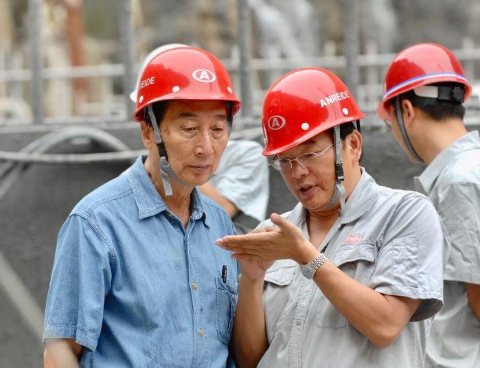 中国工程院院士、原三峡总公司总经理陆佑楣(左)和汪志林在溪洛渡建设现场讨论。