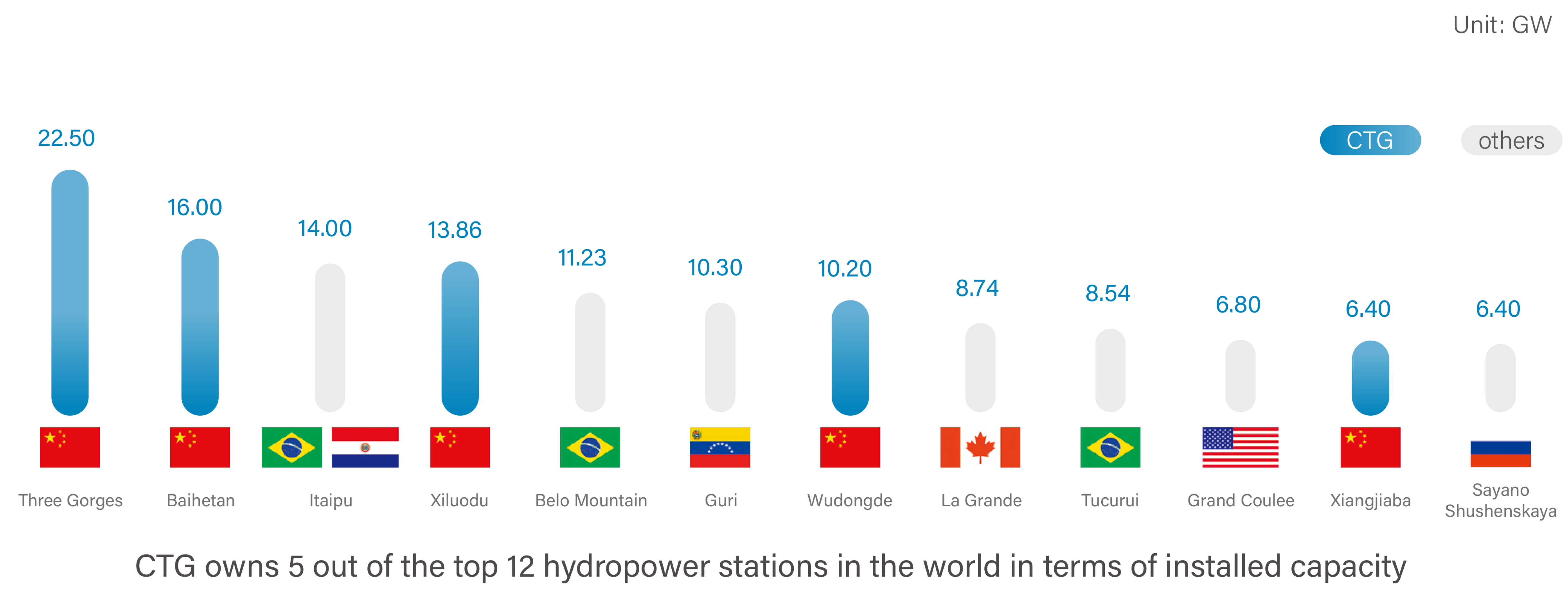 The world’s largest clean energy corridor comprises six of CTG’s hydropower projects. Four of them—Wudongde, Baihetan, Xiluodu, and Xiangjiaba—are located on the Jinsha River, the upper section of the Yangtze River, while the other two—Three Gorges and Gezhouba—are on the middle section of the Yangtze River.