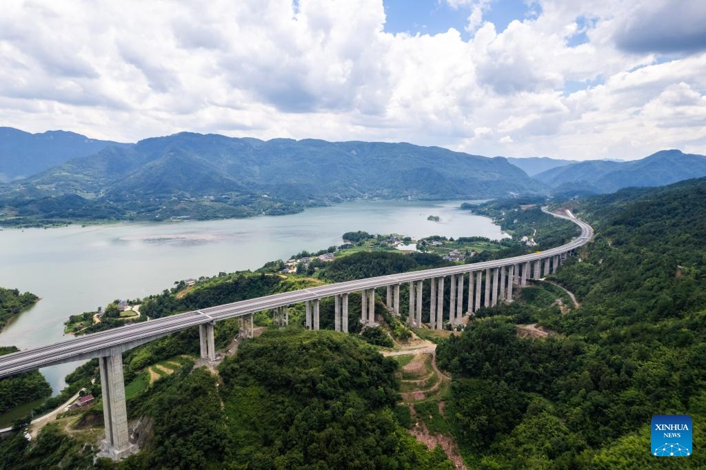 An aerial drone photo shows a grand bridge on the Luci expressway in central China's Hunan Province, Aug. 19, 2025. The Luci expressway is in the final phase of integrated system testing. Stretching 79 kilometers, this four-lane expressway will serve as a vital tourist corridor, linking major attractions from the Three Gorges of the Yangtze River to Huping Mountain national nature reserve and the Zhangjiajie National Forest Park. (Xinhua/Chen Sihan)