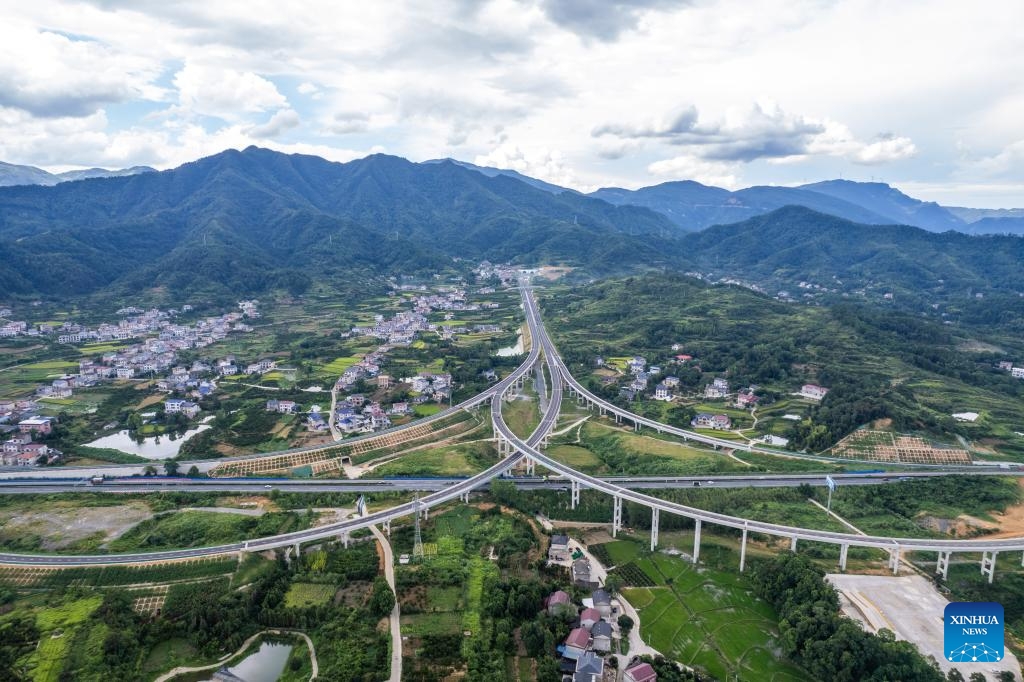 An aerial drone photo shows an interchange on the Luci expressway in central China's Hunan Province, Aug. 19, 2025. The Luci expressway is in the final phase of integrated system testing. Stretching 79 kilometers, this four-lane expressway will serve as a vital tourist corridor, linking major attractions from the Three Gorges of the Yangtze River to Huping Mountain national nature reserve and the Zhangjiajie National Forest Park. (Xinhua/Chen Sihan)