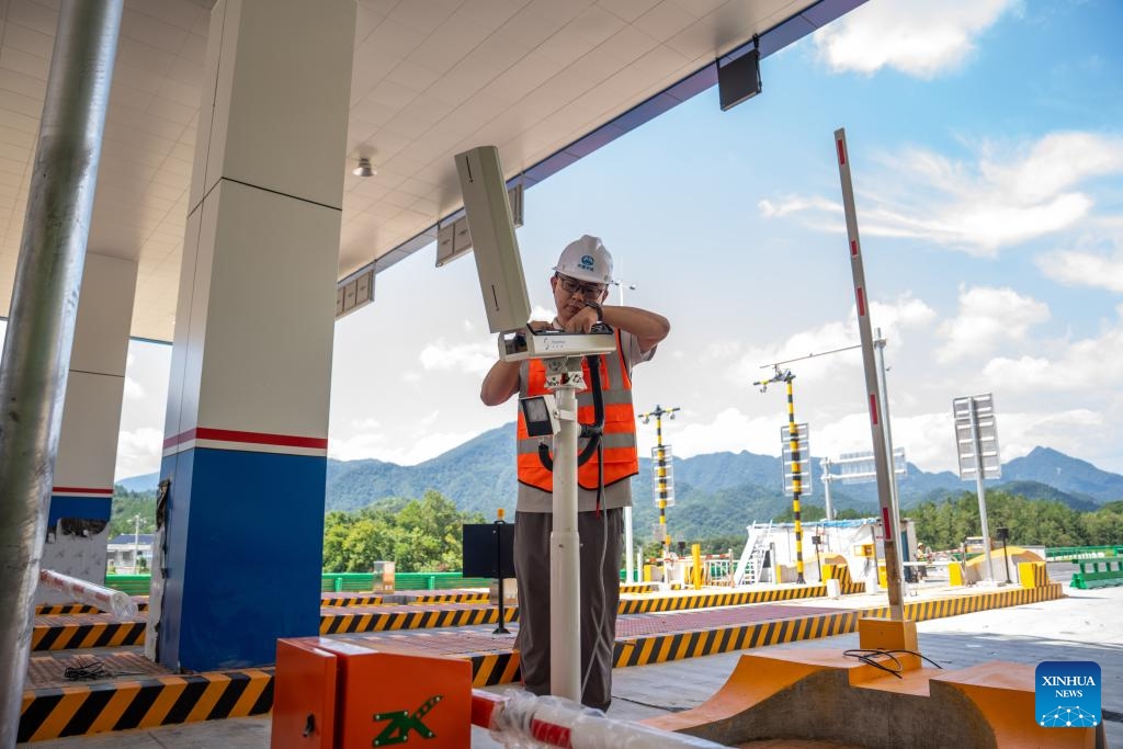 A technician calibrates ETC system at a toll station on the Luci expressway in central China's Hunan Province, Aug. 19, 2025. The Luci expressway is in the final phase of integrated system testing. Stretching 79 kilometers, this four-lane expressway will serve as a vital tourist corridor, linking major attractions from the Three Gorges of the Yangtze River to Huping Mountain national nature reserve and the Zhangjiajie National Forest Park. (Xinhua/Chen Sihan)
