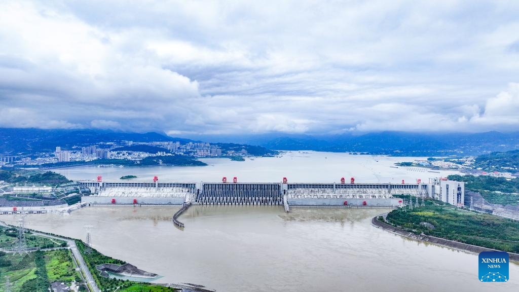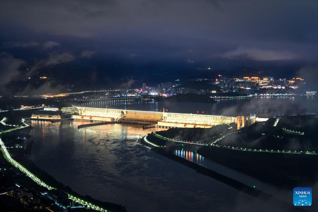 An aerial drone photo taken on Oct. 3, 2025 shows a view of the Three Gorges Dam in Yichang of central China's Hubei Province. (Xinhua/Chen Yehua)