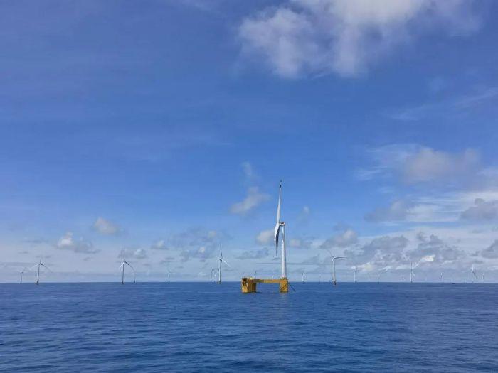 ▲ 矗立南海的全球首台抗台风型漂浮式海上风电机组“三峡引领号”