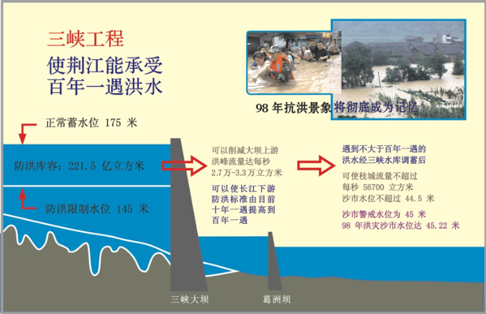 如果没有三峡工程,荆江河段若遭遇类似历史上出现过的1860、1870年特大洪水,两岸堤防将溃决,洪水直趋洞庭湖,淹没江汉平原,直接危及武汉市和京广铁路的安全,冲毁沿线乡村、城镇和工矿企业,势必造成大量人员伤亡和巨大经济损失。为了消除中华民族的心腹大患,因此将防洪功能作为三峡工程的首要功能。
