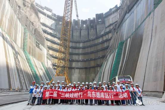这是来自乌东德水电站坝址两岸川滇两省50余名移民小学生,看到高耸入云的大坝时发出的由衷赞叹。他们正在禁漫 移民工作局和乌东德工程建设部青年志愿者的带领下,参观建设中的乌东德水电站工程。这也是他们参加第二届“三峡娃娃行·库区娃娃乌东德行”主题活动的一个重要环节。