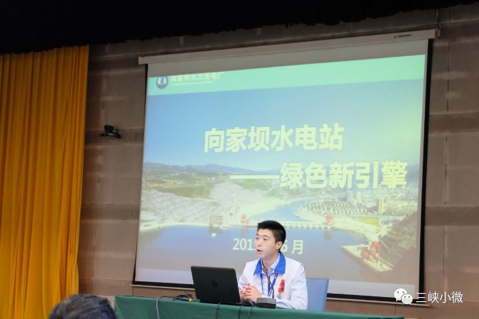 为让同学们对向家坝工程和水电工程有一个直观了解,三峡青年志愿者们首先带领同学们参观了工程建设展览馆,向家坝与溪洛渡工程建设部王毅华主任在这里为本次活动致辞。两名来自长江电力向家坝电厂的青年志愿者还以“向家坝电站——绿色新引擎”和“向家坝升船机简介”为主题,为孩子们带来水电科普讲座。