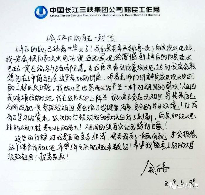 参加此次活动的50名中学生,正值爱做梦的年纪,理想的种子正在萌芽。为了激发他们为理想不懈奋斗的热情,志愿者组织同学们给五年或十年后的自己写一封信,对话未来的自己,规划自己的未来。这一环节中,岳子豪同学作为参加过往届娃娃行活动的学生代表做了发言:“是向家坝电站建设的叔叔阿姨用辛勤的汗水换来了我们今天的幸福!我一定要努力学习,将来也要成为一名水电建设者,为祖国作贡献!”