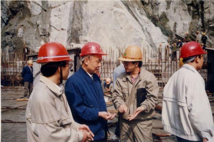 1994年,导流明渠右边坡设计,郑守仁(左二)与地质人员在现场研究危岩体处理