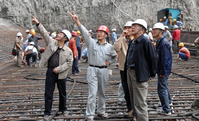 中国工程院院士、原三峡总公司总经理陆佑楣(左)和汪志林在溪洛渡建设现场讨论。