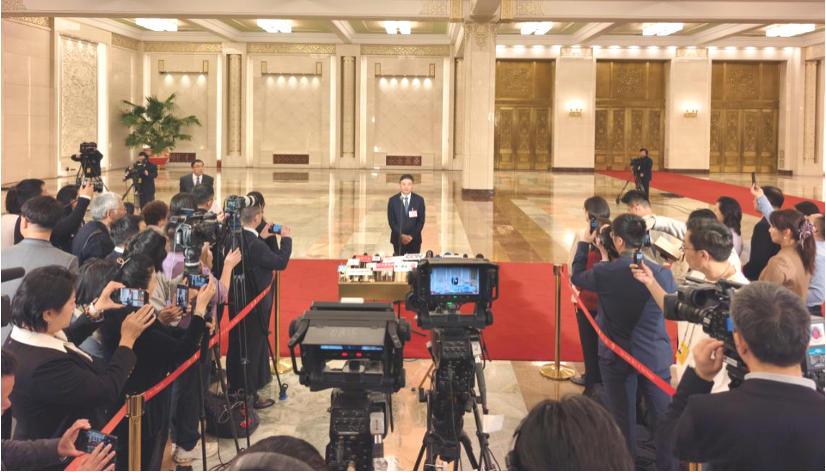 ▲ 3月12日,十四届全国人大四次会议第三场“部长通道”集中采访活动在北京人民大会堂举行。生态环境部部长黄润秋接受媒体采访。