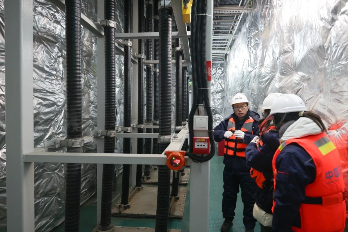 ▲ 运维人员在海上升压站上进行例行巡视检查