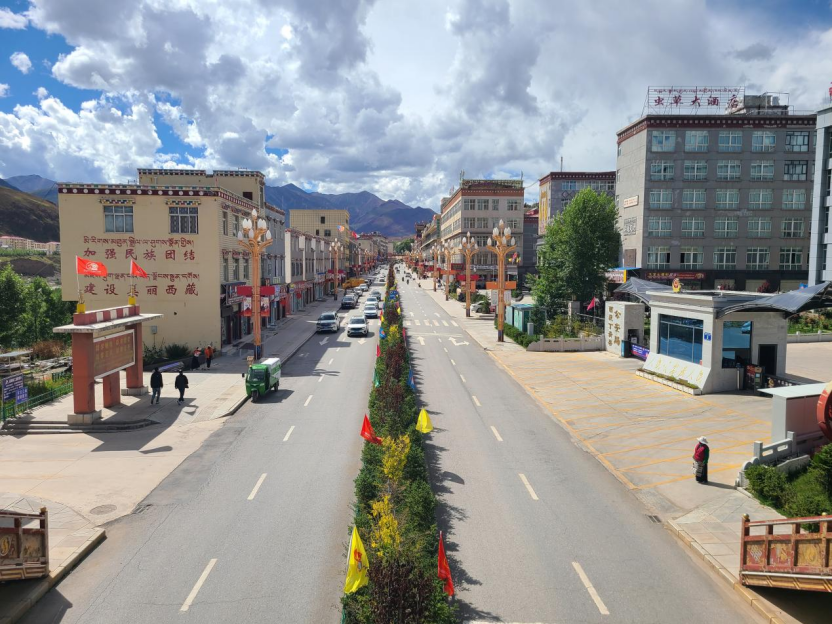 走在丁青县城,整洁的街道两旁花草相映。
