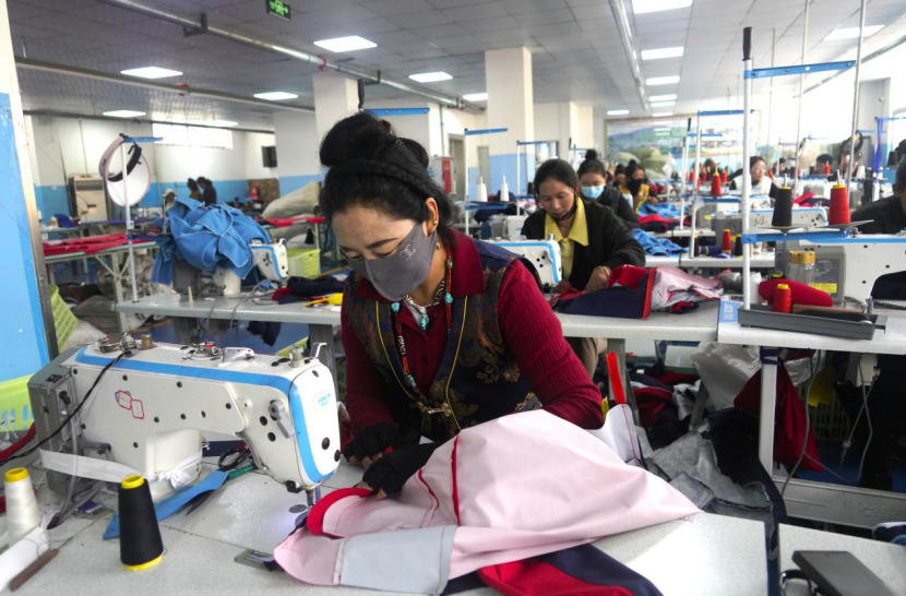 在穹鹏民族手工艺品基地,缝纫机的嗒嗒声此起彼伏,交织出一件件精美的手工藏式服饰、校服。