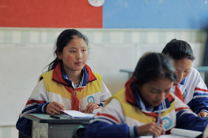 沙贡乡小学的洛松曲珍刚刚度过了一个难忘的暑假,即将小学毕业的她在课堂上格外用功。