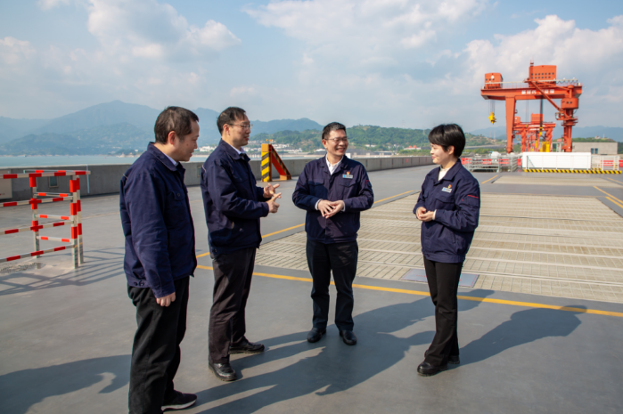 葛洲坝电厂党委委员在三峡大坝坝顶讨论交流。