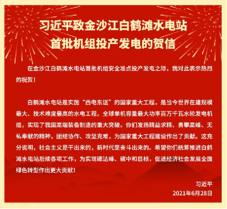 习近平致信祝贺金沙江白鹤滩水电站首批机组投产发电