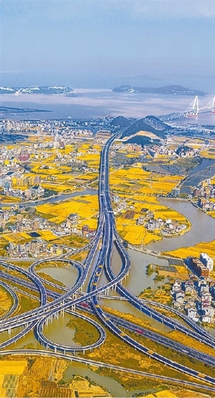 我国综合运输网络逐步完善,建成全球最大的高速公路网。图为位于浙江省温州市连接乐清湾大桥的南塘枢纽。