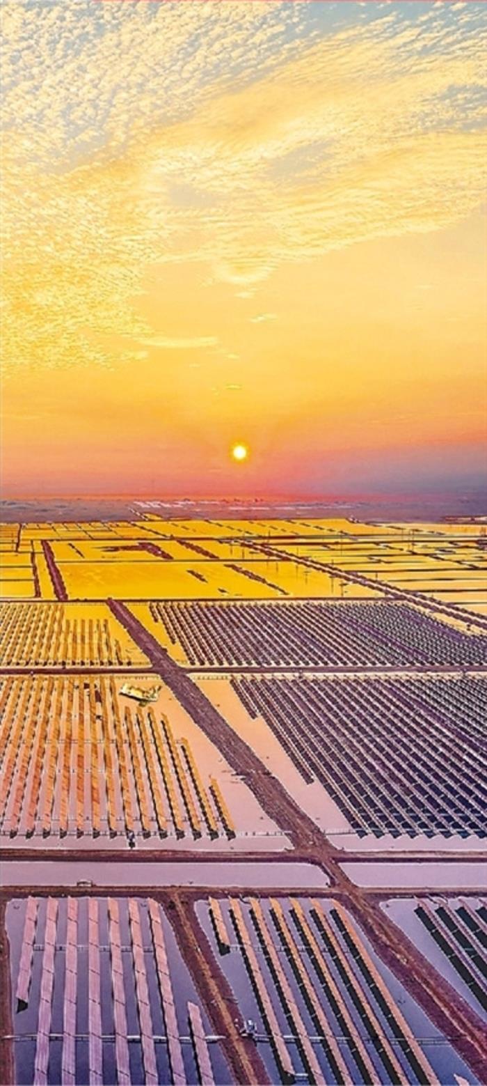 我国建成世界最大的清洁发电体系。图为山东省滨州市,朝阳下的沾化区滨海镇通汇“渔光一体”海洋牧场。