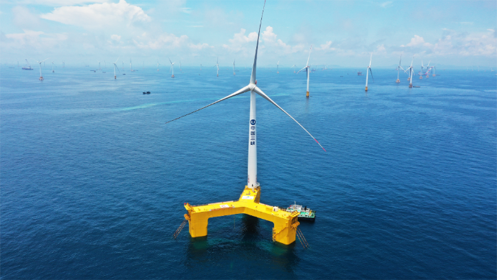 ▲我国首个漂浮式海上风电平台,搭载全球首台抗台风型漂浮式海上风电机组,组成“三峡引领号”,在广东阳江海上风电场成功并网发电(三峡能源供图)