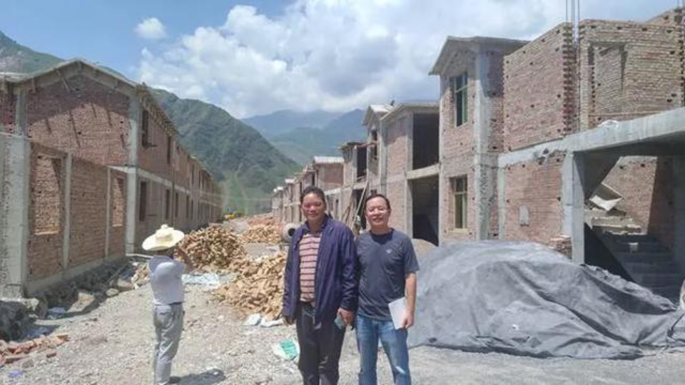 孟广林(右一)检查布拖县特木里镇集中安置点建设情况