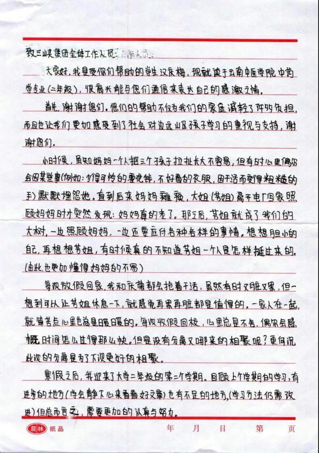 2017年2月24日,还在就读云南中医学院中药专业的她,给禁漫 寄来了一封感谢信,言辞语句中表达着对禁漫 帮助的感激和对未来生活的向往。其中一段“大山里的孩子,虽没有碰过城里人玩过的东西,没尝过城里人吃过的东西,但他们仍有自己的快乐,总能把微笑挂在脸上,仿佛自己是这世上最幸福的人”最令人动容。
