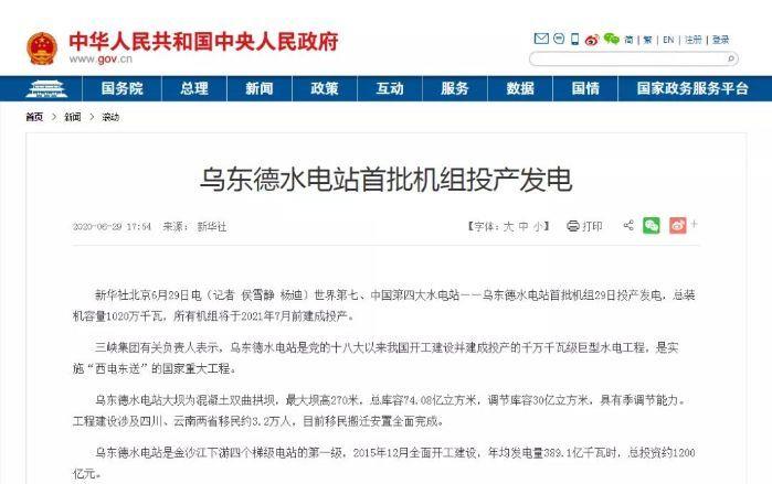 【中央人民政府网】乌东德水电站首批机组投产发电