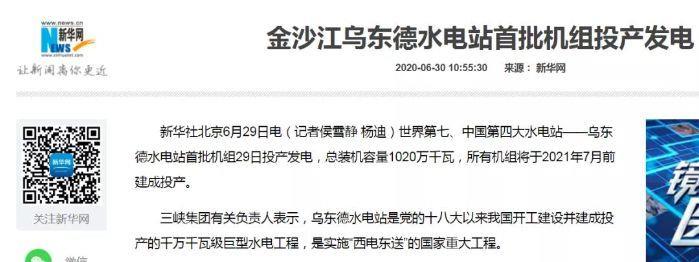 新华社北京6月29日电(记者侯雪静 杨迪)世界第七、中国第四大水电站——乌东德水电站首批机组29日投产发电,总装机容量1020万千瓦,所有机组将于2021年7月前建成投产。