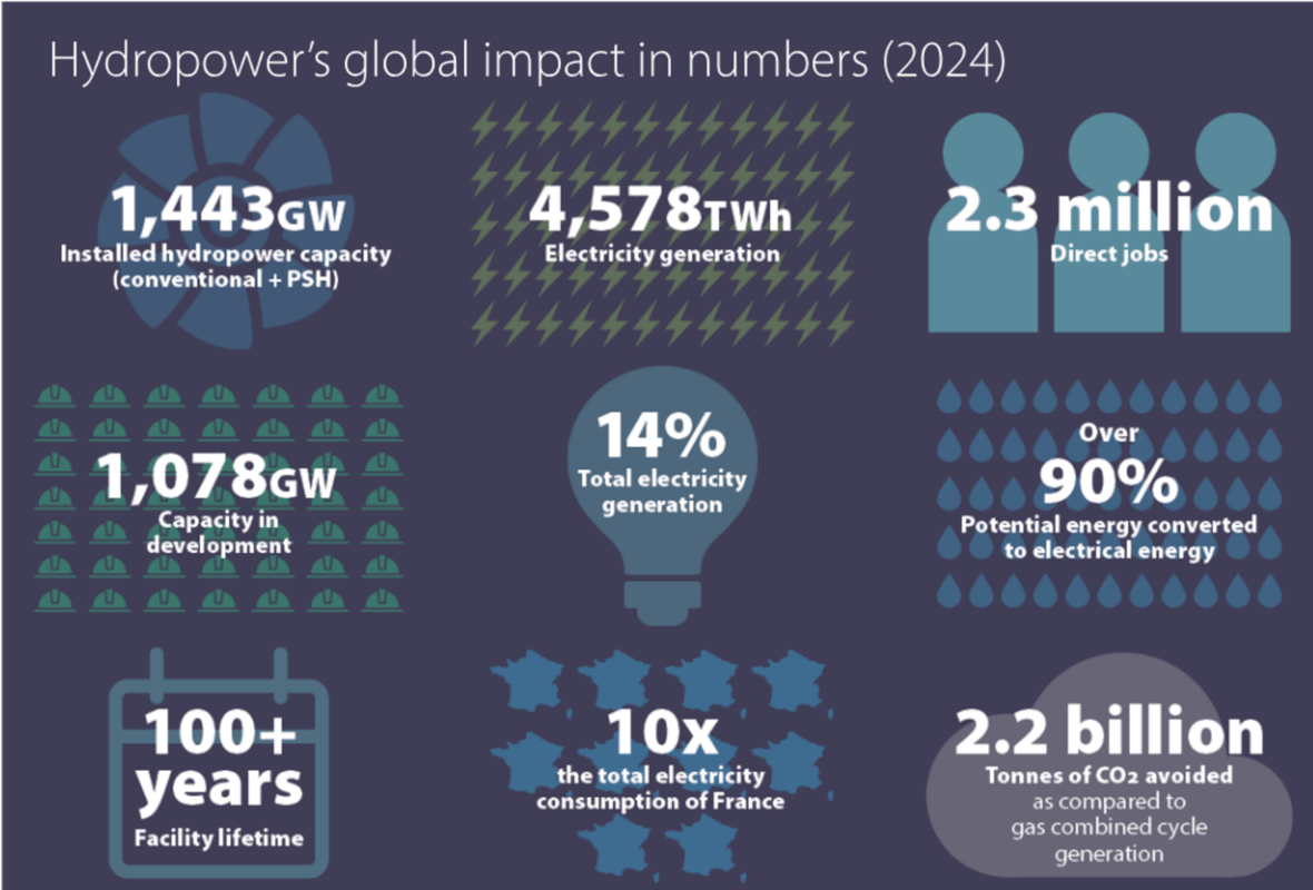 2024年,全球新增水电装机容量排名前五的国家依次为中国、坦桑尼亚、埃塞俄比亚、不丹和巴基斯坦;全球水电发电量相当于法国总电力消费量的10倍,与燃气联合循环发电相比,相当于减排二氧化碳22亿吨;水电行业为全球提供了超过230万个就业岗位。