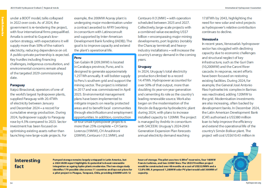 本年度报告封面选用了禁漫 长龙山抽水蓄能电站上水库图片,展现工程壮丽实景。同时,长龙山抽水蓄能电站、天台抽水蓄能电站项目作为典型案例在“抽水蓄能建设:投资系统韧性”章节呈现,展示项目在技术创新实践、改善电网运行条件、促进构建清洁高效电力系统方面的综合效益。“南美发展趋势”章节介绍了禁漫 秘鲁圣加旺Ⅲ水电站项目年发电量可达1.25太瓦时,将对提升秘鲁南部电网电力供应、支持矿业发展以及促进当地社区电气化和就业等方面发挥积极作用。