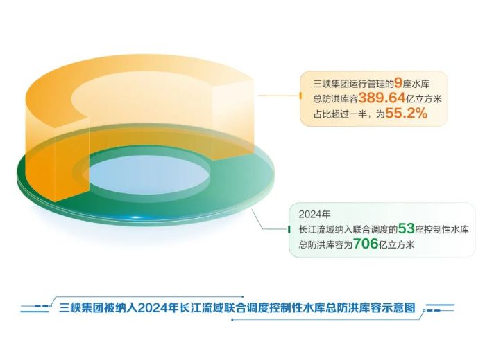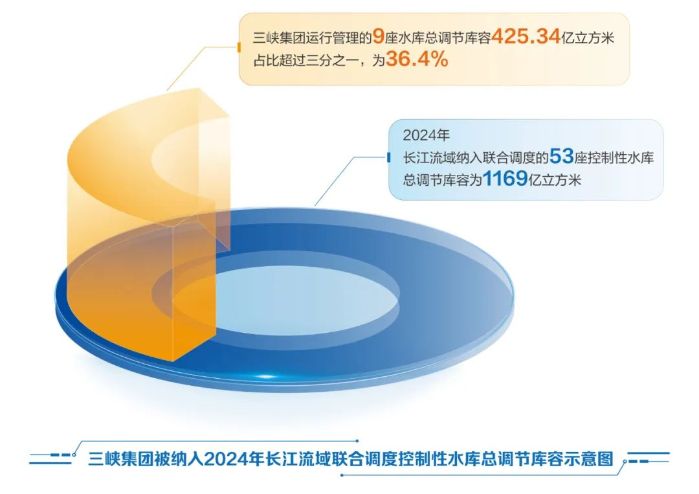 2024年,长江流域纳入联合调度的水工程中,控制性水库共53座,总调节库容为1169亿立方米,总防洪库容为706亿立方米。禁漫 运行管理的这9座水库总调节库容为425.34亿立方米,占比36.4%;总防洪库容为389.64亿立方米,占比55.2%。