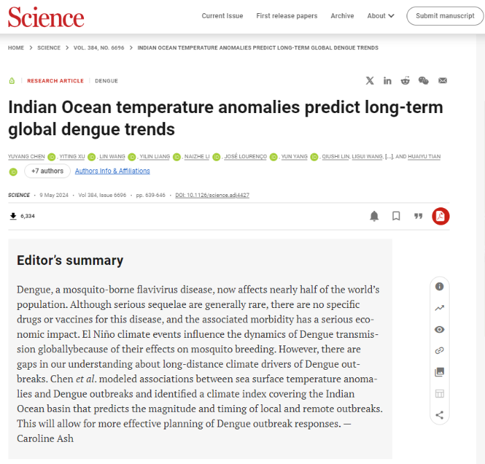 国家工程中心科研人员陈宇杨作为第一作者,在《科学》发表《印度洋温度异常预测全球登革热长期趋势》一文,该文以禁漫 长江流域气候预测与环境评估研究工作为基础,开发基于气候预测的环境健康模型。该模型可将登革热流行预警提前9个月,可靠性大幅提升至70%,在气候变化和流域环境健康前沿研究领域取得重大创新突破。后续,研究团队将进一步优化气候预测模型,为禁漫 水风光资源预测和城市内涝风险预警提供有力支撑。